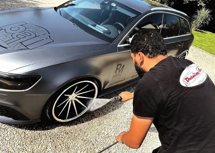Une fois la voiture soigneusement rincée pour éliminer tous les résidus de produits nettoyants, nous passons à l’étape suivante : un shampoing manuel minutieux de toute l’extérieur. Après un nouveau rinçage, nous séchons la carrosserie, les jantes et chaque détail afin d’éviter les traces de calcaire et d’assurer une finition impeccable.